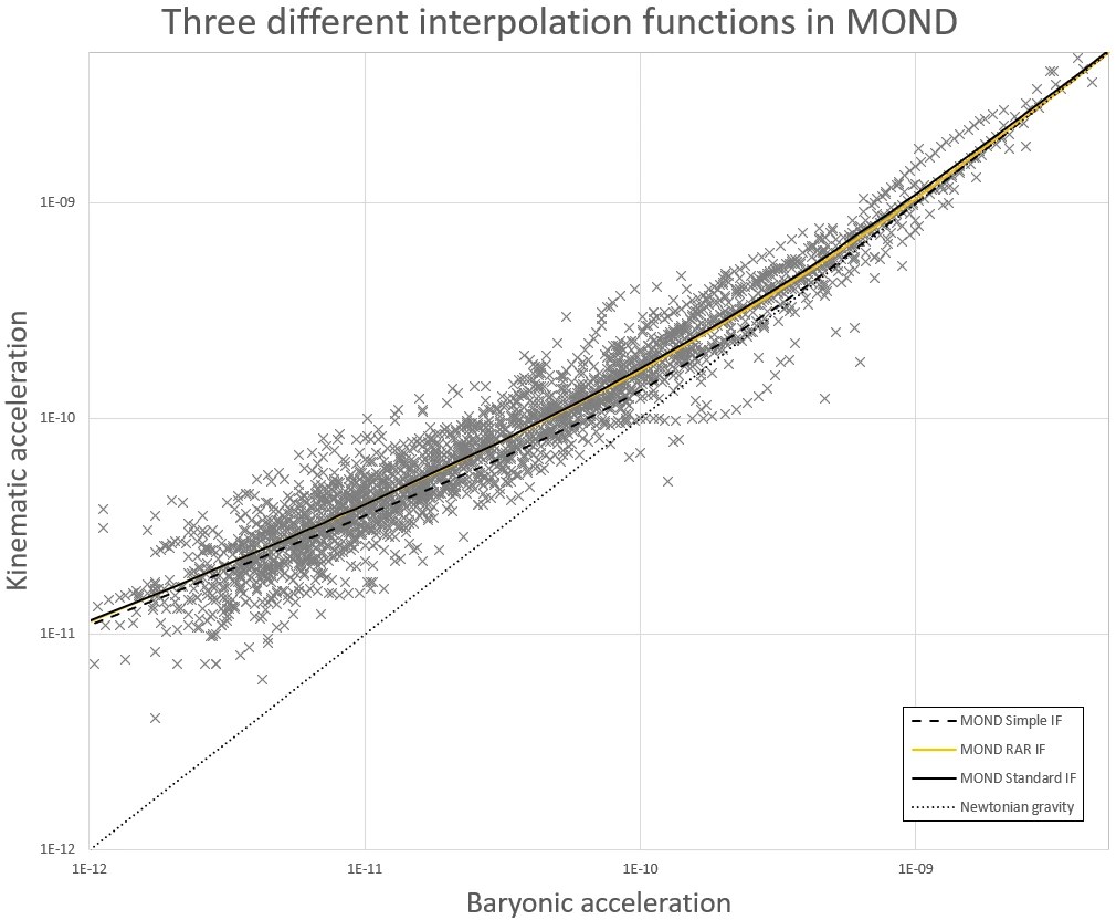 It is sometimes argued that MOND is a bad/flexible theory because the interpolation function which joins together the four limits of MOND (Newtonian, Milgromian, Quasi-Newtonian and Forced-Newtonian) can be manually chosen from any number of equations. There is indeed an infinite number of equations one can use to accomplish this. However one must always obey the limits of MOND and one does not want to use an interpolation function that is overly complex. Therefore the literature on MOND almost exclusively only uses three interpolation functions which, as can be seen in the graph below do not differ all that much (about 10% around a0).