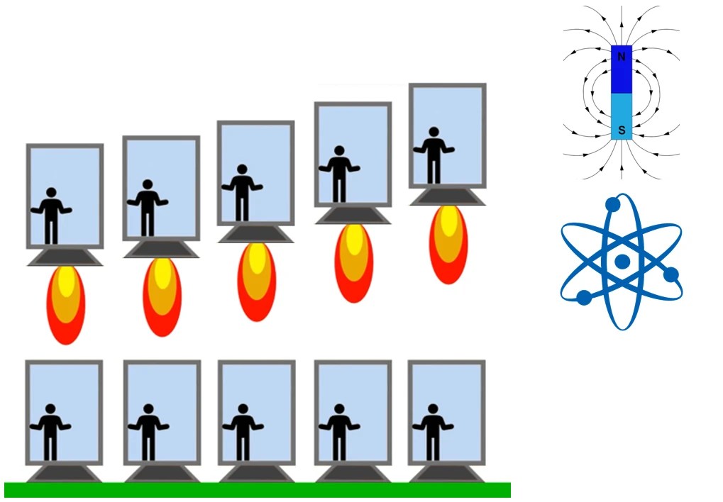 In other words the EEP states that you can’t tell whether you are in a rocket or an elevator going up or standing still on a planet (if you ignore the vibrations any real engine would cause of course). No experiment using the forces of electromagnetism, the weak nuclear force or the strong nuclear force can distinguish between being accelerated by a gravitational field or by some other force pushing you. The same is true for free fall and simply floating in deep space. If you can’t look outside, you can’t tell the difference.