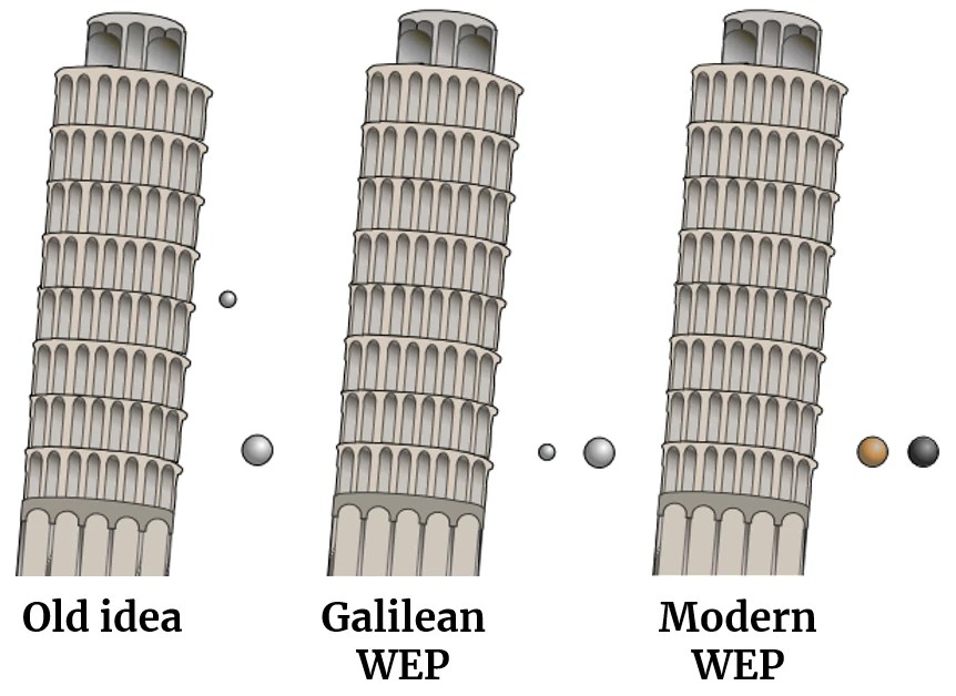 The WEP means that objects all fall at the same speed under the same gravity (if we ignore air resistance which may differ). In the olden days of Greek philosophy, particularly in the thinking of Aristotle, people thought that heavier things fell faster. All things had their accustomed place where “they wanted to be” which is why rocks sink in water but wood doesn’t, why smoke and fire rise and why air is above the water and the earth. This thinking was challenged by many in the 16th century but by none more famously than by Galileo Gallilei.