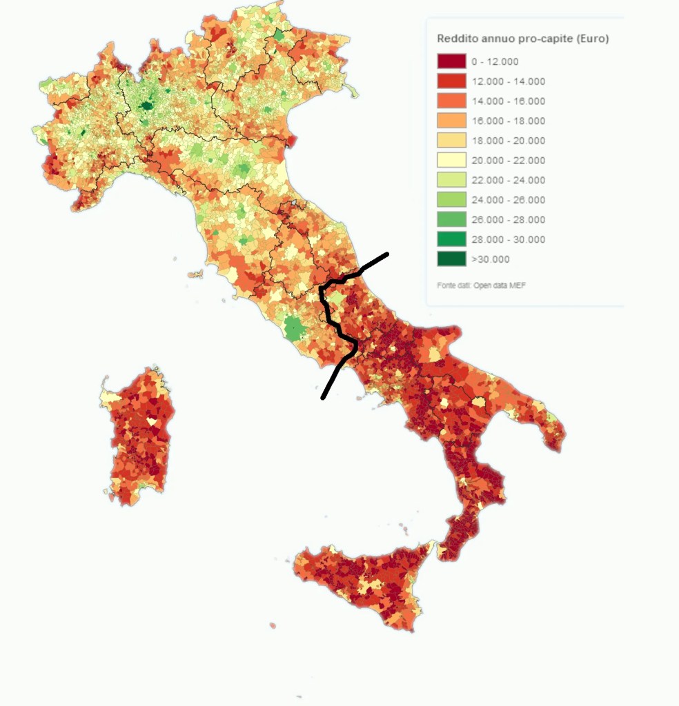 The phantom borders in Poland, Romania, Germany and as we’ll see later also in Italy are caused by countries having different policies and as a result different degrees of economic success. These economic disparities can persist far longer than the borders do, primarily because the infrastructure lives on. This can even persist when the population of a region is completely replaced. The western half of Poland used to be primarily populated by Germans until the end of the second world war. At the end of the war the Red Army drove the Germans out of their historic homelands and awarded it to the Poles (which then allowed them to steal historically Polish lands and settle those with Belarusians, Ukrainians and Russians). So even though poor Polish peasants from the far east of Poland were moved into the now formerly German cities in the west we still see these people voting for the liberal, progressive and upper middle class political party today. Their cultural norms have adapted based on the existing infrastructure defined by the phantom border. An excellent natural experiment to support cultural Evolutionary Modernization Theory.