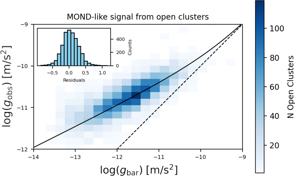 The plot only based on the precise proper motions shows that open clusters follow the RAR. That solid black line was first posited in 1983 and it just pops up in the data four decades later. Open clusters must happen to reside in those parts of the galaxy where the external field is negligible due to local matter distribution causing a pocket of space where the gravitational field is very small. Otherwise this result is impossible due to the external field effect.