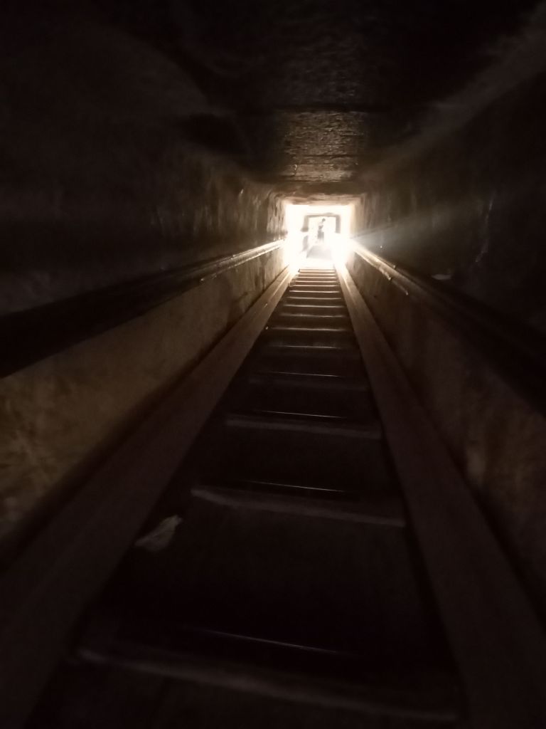 Not only were the dead meticulously mummified, they were then burried in elaborate but hard to access tombs (to prevent grave robbing). The most magnificent of which are of course the pyramids. Below you’ll see two pictures of me entering one on my tour. Entering a pyramid is much like bouldering sideways through a tunnel barely high and wide enough to fit through for several hundred meters in a sauna. I wondered in advance why that part of the tour was optional. Oh boy do I get it now!