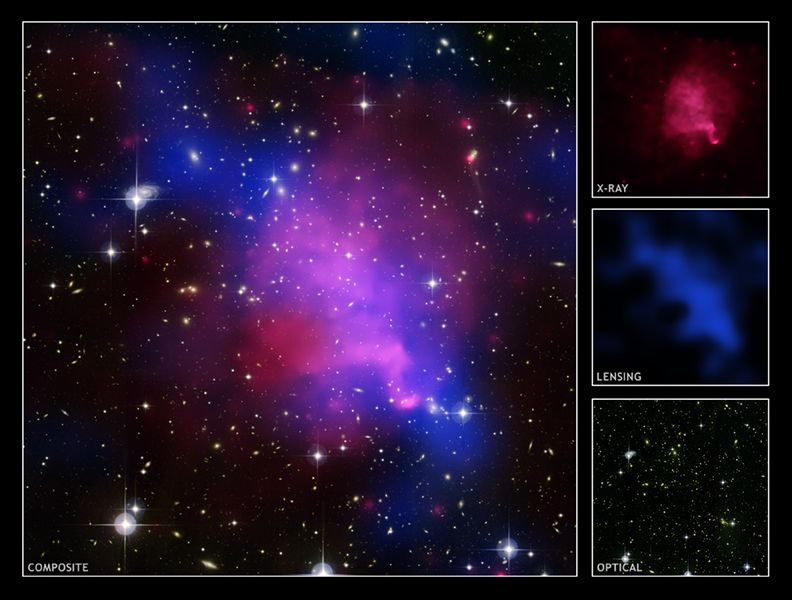 This composite image [see below] shows the galaxy cluster 1E 0657-56, also known as the “bullet cluster”, formed after the collision of two large clusters of galaxies. Hot gas detected by Chandra is seen as two pink clumps in the image and contains most of the “normal” matter in the two clusters. An optical image from Magellan and the Hubble Space Telescope shows galaxies in orange and white. The blue clumps show where most of the mass in the clusters is found, using a technique known as gravitational lensing. Most of the matter in the clusters (blue) is clearly separate from the normal matter (pink), giving direct evidence that nearly all of the matter in the clusters is dark. This result cannot be explained by modifying the laws of gravity.