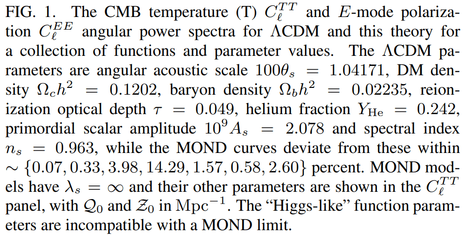 A modern extension of MOND called AeST (Aether-Scalar-Tensor theory), provides a relativistic formulation that fits CMB observations reasonably well. Thus demonstrating that MOND-like dynamics can be embedded in a broader theoretical framework compatible with cosmology. To do so AeST does require four different parameters which makes it more complicated that LCDM and essentially introduces a form of dark matter in a roundabout way. So whether such extensions can become as useful as LCDM for doing cosmology is doubtful. But at least MOND extensions can fit the CMB and the matter power spectrum. Two decades after LCDM did it but it’s something..