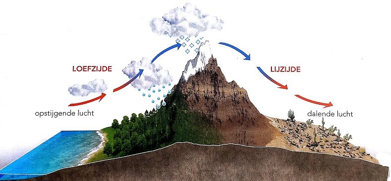 Vanuit het vliegtuig heb ik de bovenstaande foto geschoten waarin mooi stuwingsregen te zien is. Boven de donker bruine bergketen ligt een smalle strook met wolken in verder strak blauwe hemel. Ook zien we dat door deze wolken en de regen die dit oplevert het land in de voorgrond groen is. Achter de bergen in de linker bovenhoek is het een en al woestijn..